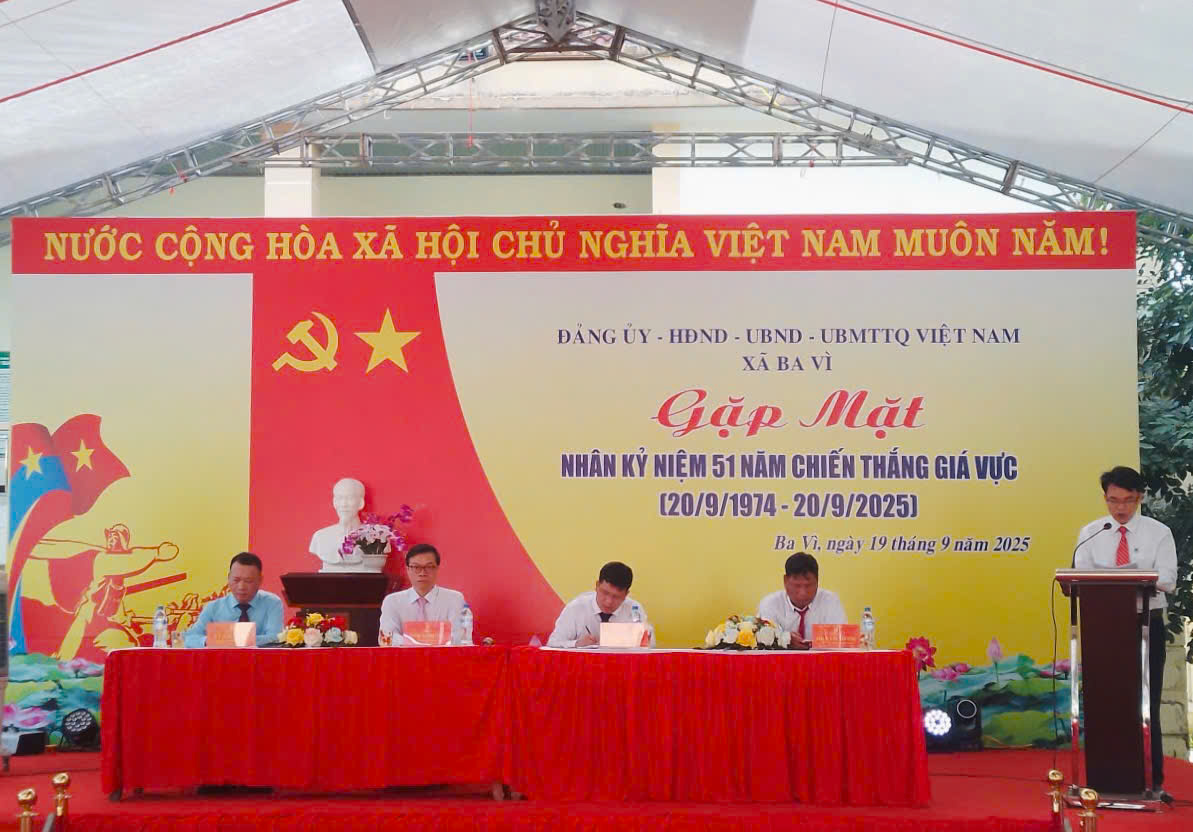 Chiều 19/9, tại nhà văn hóa xã Ba Vì, Đảng ủy, HĐND, UBND, Ủy ban MTTQ Việt Nam xã Ba Vì đã long trọng tổ chức Gặp mặt kỷ niệm 51 năm Chiến thắng Giá Vực (20/9/1974 – 20/9/2025). Với sự tham dự của các đồng chí nguyên lãnh đạo huyện qua các thời kỳ; lãnh đạo các xã bạn, cựu chiến binh từng tham gia các trận chiến ác liệt bảo vệ quê hương cùng đông đảo cán bộ lãnh đạo, nguyên lãnh đạo, cán bộ công chức, đại biểu doanh nghiệp và nhân dân địa phương.