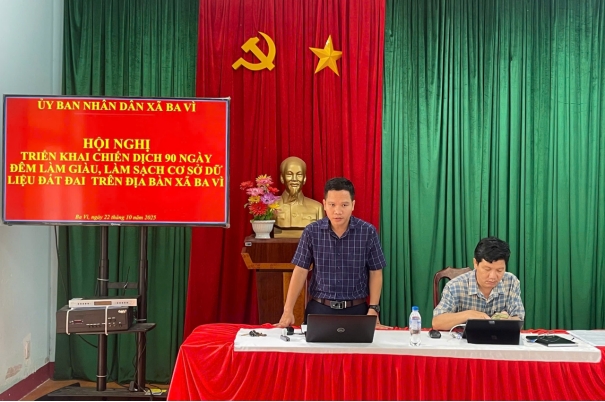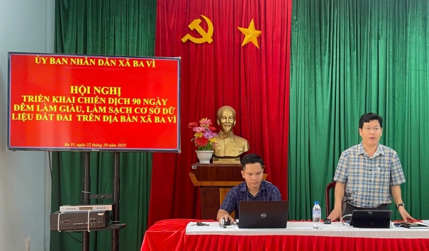Sáng ngày 22/10/2025, UBND xã Ba Vì đã tổ chức Hội nghị triển khai thực hiện Kế hoạch số 515/KH-BCA-BNN&MT ngày 31/8/2025 của liên Bộ Công an – Bộ Nông nghiệp và Phát triển nông thôn – Bộ Tài nguyên và Môi trường và Kế hoạch số 341/KH-UBND ngày 10/9/2025 của UBND tỉnh Quảng Ngãi về việc triển khai Chiến dịch 90 ngày làm giàu, làm sạch cơ sở dữ liệu đất đai, trên địa bàn xã Ba Vì.